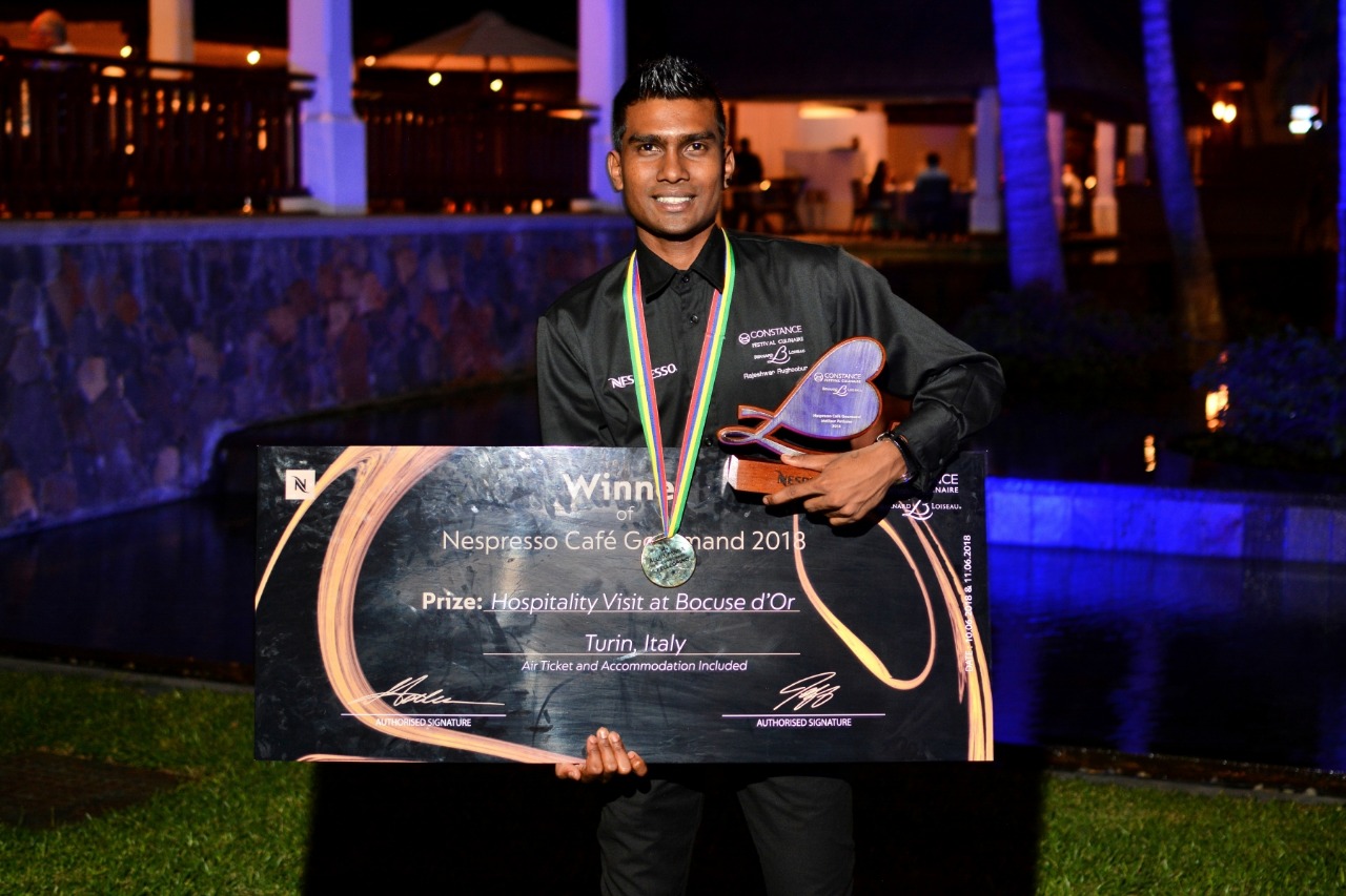 En remportant le prestigieux concours Café Gourmand by Nespresso, Rajeshwar Rugoobur s’est vu offrir une place aux célèbres Bocuse d’Or qui auront lieu à Turin, en Italie, en juin. La lutte était très serrée entre les quatre candidats du concours, tous commis de Constance et experts dans l’art de sublimer une tasse de café. A travers cette compétition, et ce depuis 2011, Nespresso apporte sa contribution au Festival Culinaire Bernard Loiseau, l’un des plus importants événements gastronomiques de l'océan Indien. Le rituel de la tasse de café après le repas est en effet désormais indissociable de la haute cuisine, et savoir préparer correctement un breuvage caféiné est tout un art. Outre sa participation aux Bocuse d’Or, Rajeshwar Rugoobur aura l’honneur de voir sa création incorporée à la carte des hôtels Constance.