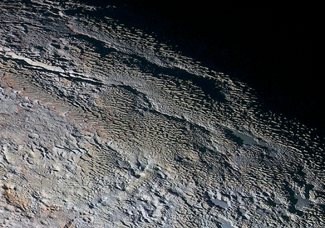 De nouvelles images transmises par la sonde New Horizons dévoile une brume bleue entourant Pluton et de l'eau glacée retrouvée à sa surface dans plusieurs petites régions exposées.