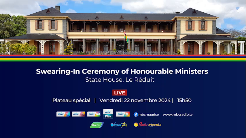 Cérémonie de prestation de serment des nouveaux ministres à la State House à 16 h ce vendredi après-midi. Une cérémonie que vous pourrez suivre en direct à la télévision sur MBC 1, MBC 3, MBCSAT, Rodrigues TV à la radio sur RADIO Maurice,  Kool FM, Taal FM et sur nos plateformes numériques MBCPLAY, le siteweb mbcradio.tv et sur la page Facebook de la MBC. Un plateau spécial vous sera proposé à partir de 15 h 50.